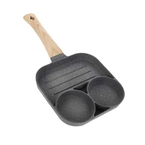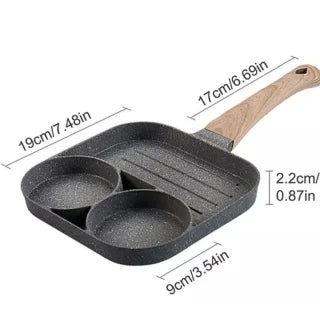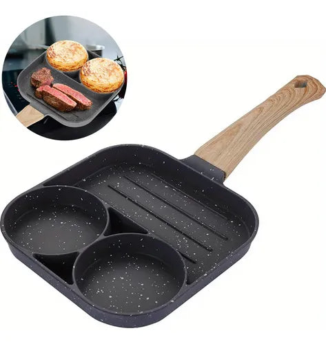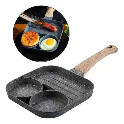 Revoluciona tus desayunos con nuestra Sartén Antiadherente de 3 Compartimentos, ideal para preparar huevos, panqueques, hamburguesas o tortillas de forma rápida y sin complicaciones. Su diseño con tres cavidades permite cocinar varios alimentos a la vez sin que se mezclen los sabores, logrando resultados perfectos y presentaciones profesionales. El revestimiento antiadherente evita que los alimentos se peguen, facilita la limpieza y garantiza una cocción más saludable con menos aceite.